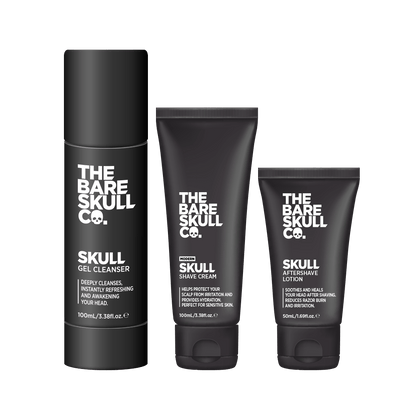 Achieve a smooth, irritation-free shave with The Bare Skull '101' Kit - Modern, tailored for bald men and head shavers. Elevate your routine and revitalize your look with our premium ingredients in three essential products.