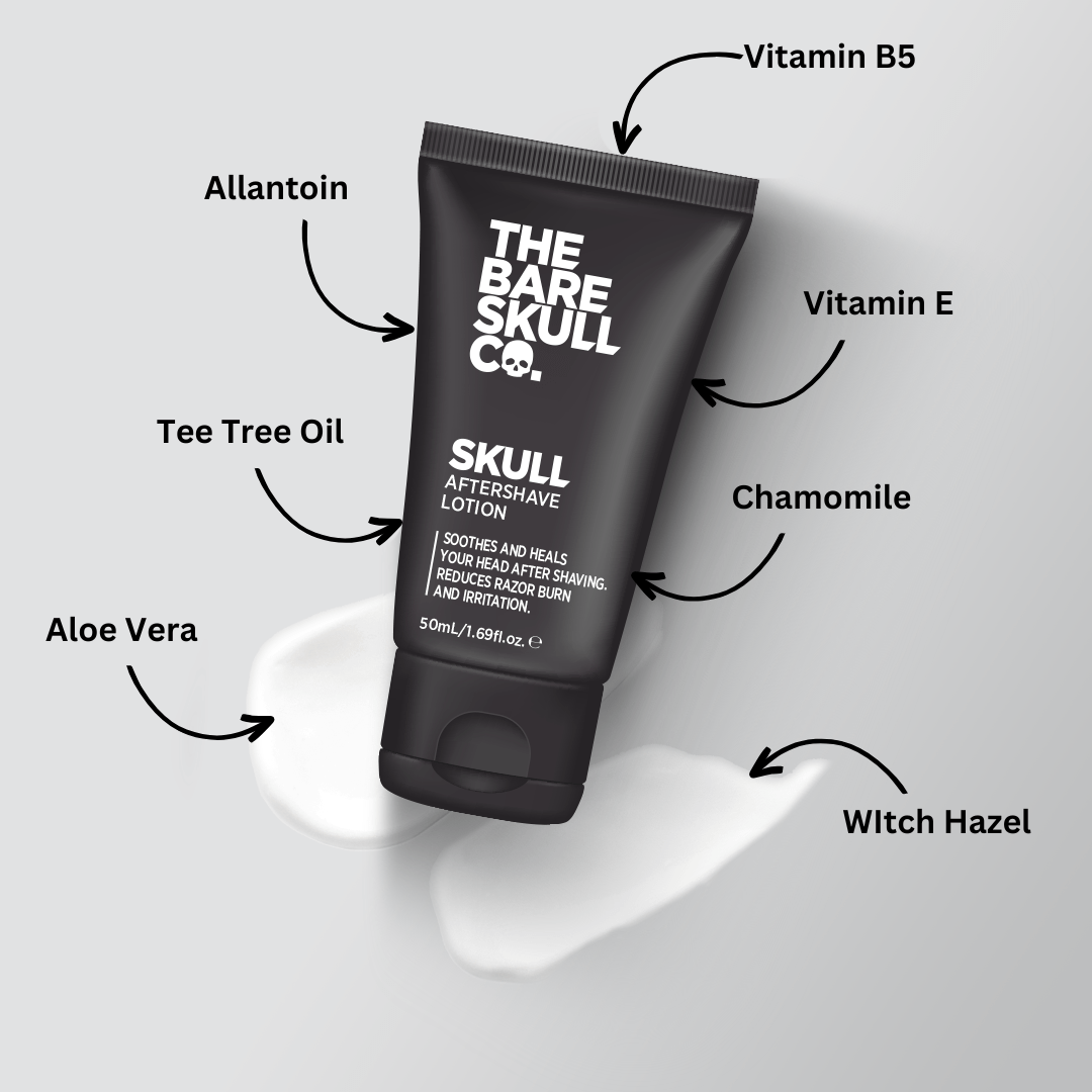 Skull Aftershave Lotion: Aqua, Glyceryl Stearate Citrate, Cetearyl Alcohol, Glyceryl Stearate, Stearic Acid, Caprylic/Capric Triglycerides, Sodium Lactate, Panthenol, Allantoin, Cetyl Palmitate, Aloe Barbadensis Leaf Juice Powder, Tocopheryl Acetate, Melaleuca Alternafolia (Tea Tree) Leaf Oil, Matricaria Recutita (Chamomile) Extract, Hamamelis Virginiana (Witch Hazel) Water, Benzoic Acid, Xanthan Gum, Dimethicone, Cyclopentasiloxane, Sodium Hydroxide, Disodium EDTA, Phenoxyethanol, Ethylhexylglycerin, Parfum, Silica