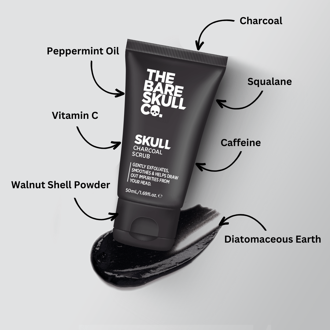 - Skull Charcoal Scrub: Gently exfoliates dry, flaky skin with mint, caffeine, and charcoal.
