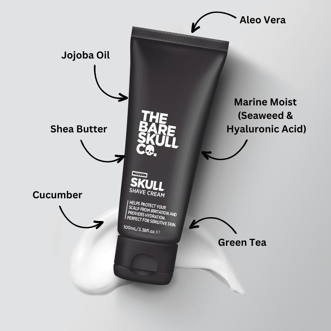 - Modern Skull Shave Cream provides maximum protection and moisturises with Coconut Oil, Green Tea, Aloe Vera, and Shea Butter.