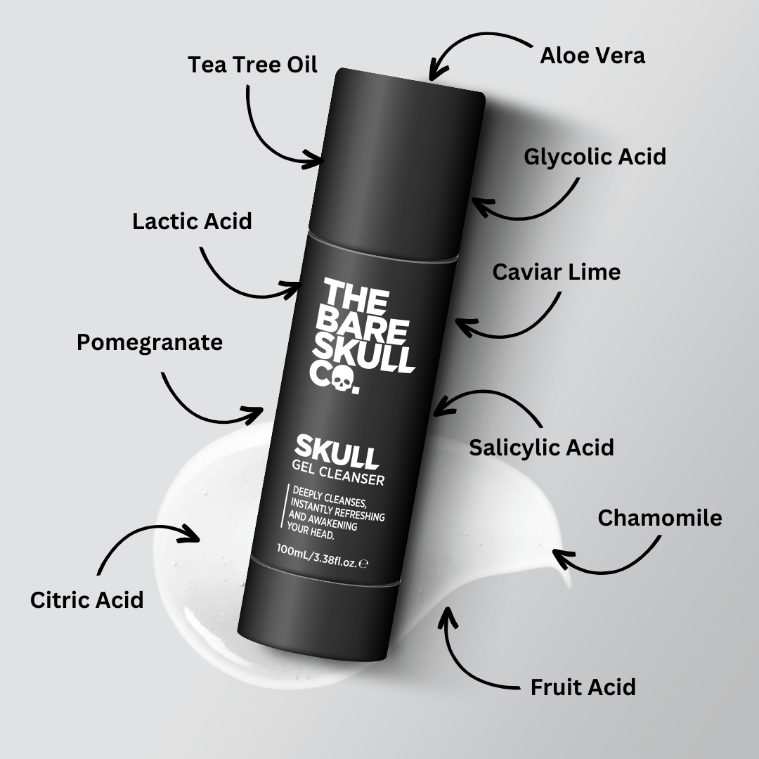 - Skull Gel Cleanser deeply cleanses without stripping natural oils, combating impurities and dandruff.
